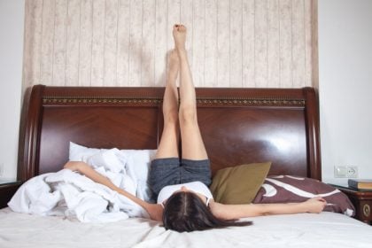 Mulher deitada em uma cama com as pernas levantadas para o alto