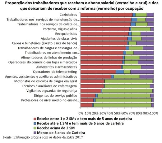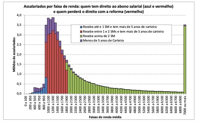 Com a reforma, 24,3 milhões de trabalhadores perderiam esse direito por estarem na faixa de um a dois salários mínimos, ou seja, 93,6% dos que têm o direito ao abono perderiam este direito com a reforma. Isso significa, em média, uma redução de 5,7% na renda dessas pessoas.