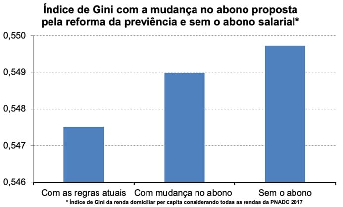 Mas a reforma da previdência propõe manter o benefício para quem ganha até 1 salário mínimo, o que ameniza efeito concentrador de renda. Ainda assim, ao aplicar as regras para o abono da PEC 6/2019, o índice de Gini aumenta de 0,5475 para 0,5489.