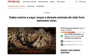 “A caça é uma atividade covarde e anacrônica, que não deveria ser permitida em lugar nenhum do mundo”, afirma o movimento na petição mais recente. O grupo alerta que a onça-pintada, um dos maiores símbolos da fauna brasileira, está sendo brutalmente dizimada. Para o movimento, a impunidade e as leis brandas para este crime estimulam a caça ilegal.