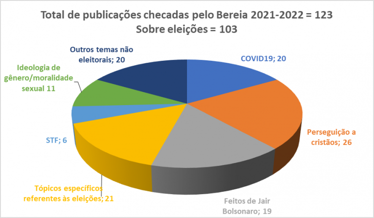 Bereia é a única iniciativa de fact-checking especializada em religiões, monitora sites gospel e mídias sociais de personagens com identidade religiosa consideradas influenciadoras digitais. O projeto identificou outras cinco abordagens predominantes direcionadas às eleições: tópicos específicos referentes ao pleito (itens de campanha, pesquisas de voto, papel do Tribunal Superior Eleitoral, ataques a candidatos), covid-19, “ideologia de gênero/moral sexual”, Supremo Tribunal Federal (STF), Feitos de Jair Bolsonaro.