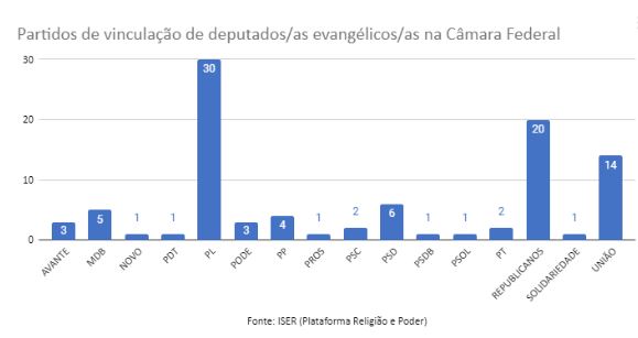 O traço conservador que tem marcado a Bancada Evangélica no Congresso Nacional se mantém no perfil dos partidos aos quais estão vinculados os deputados federais: 74 pertencem àqueles identificados com a direita, 17 com os de centro e quatro com os de esquerda. Os evangélicos/as de direita são predominantemente pentecostais, 42 (17 das Assembleias de Deus, 14 da Universal do Reino de Deus, 11 de outras denominações). Os demais são de igrejas históricas (nove batistas, dois presbiterianos, um anglicano e um luterano), um não tem vinculação  e 18 são de igrejas não identificadas pela pesquisa do ISER.