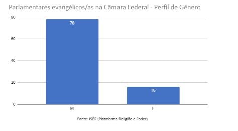 No que diz respeito a gênero, há intensa desigualdade: são 78 homens evangélicos que ocupam cadeiras na Câmara Federal, frente a 18 mulheres. Apenas duas delas são ligadas a partidos de esquerda, duas a partidos de centro e 14 seguem a tendência conservadora do grupo, com vinculação a partidos de direita.