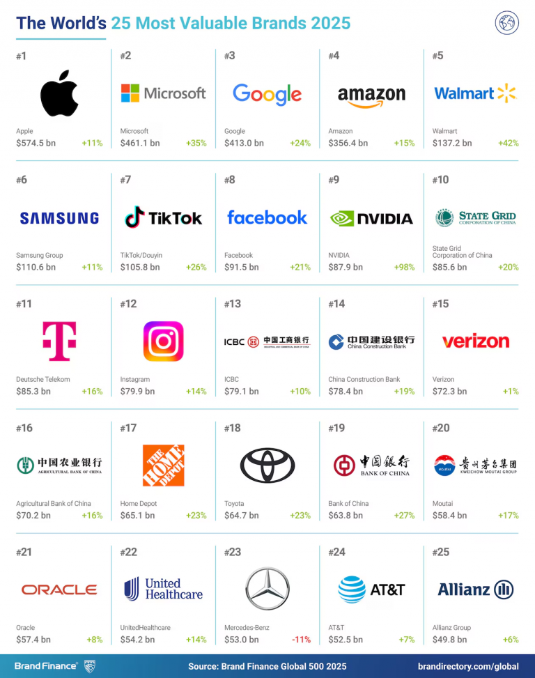 Foi divulgado o Ranking Global 500 da consultoria Brand Finance. Apple é a marca mais valiosa do mundo (US$ 574,5bi), seguida por Microsoft, Google e Amazon nas quatro primeiras posições. Somadas, as marcas valeriam, hoje, US$ 1,9 trilhões. Se isso fosse o PIB, as gigantes de tecnologia seriam a 12ª economia global, muito perto de Canadá, Brasil e Rússia. À frente de Coreia, México e Austrália. Se acrescentarmos Samsung, TikTok, Facebook, NVIDIA, Instagram e Oracle, todas do setor de tecnologia, o número chega a US$ 2,34 tri, fazendo com que as marcas superassem economias como Canadá e Brasil, praticamente empatando com a Itália. Assim essas Big Ten seriam a 9ª economia mundial. Claro que se o critério fosse faturamento os números seriam outros.