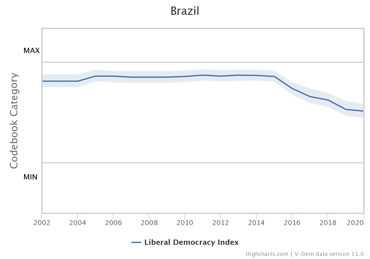 E, para não ficarmos apenas no índice da revista britânica, consideremos também o do projeto Varieties of Democracy (V-Dem), que mostra um cenário muito similar. Segundo essa outra apreciação, o Brasil melhora justamente após a posse de Lula e começa declinar após o impeachment de Dilma. Veja-se o gráfico.