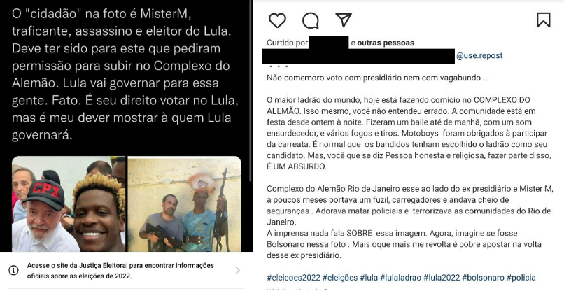 Uma das postagens que circula exibe a foto de Lula com o ator Diego Raymond, de 37 anos, atacado por apoiadores do presidente Jair Bolsonaro. A rede de desinformação bolsonarista compartilhou diversas mentiras contra o ator nas redes sociais, entre elas, que Diego “é um dos maiores bandidos do Rio de Janeiro”. Além do teor racista, essas mensagens podem trazer risco de vida imediato a Diego. Além do ator, trabalhadores e trabalhadoras que residem no Complexo do Alemão também receberam a pecha de bandidos.