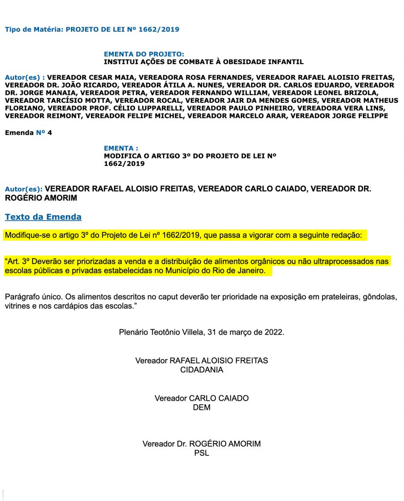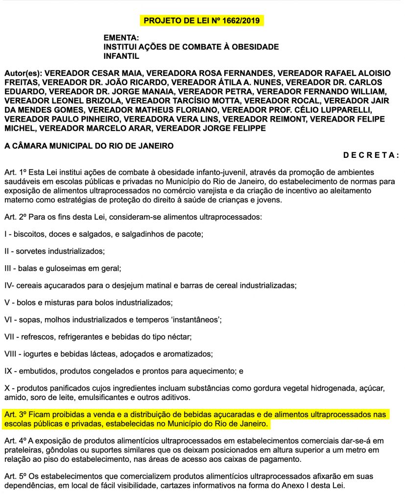 “A obesidade, assim como todas as outras condições crônicas, é de difícil manejo clínico e exige urgente prevenção. Na faixa etária de 5 a 19 anos, o número de indivíduos com excesso de peso triplicou nos últimos 20 anos. Sendo assim, o presente projeto pretende resguardar e garantir o direito pleno dessa população a uma alimentação adequada e segura, em consonância com o Estatuto da Criança e do Adolescente [ECA]”, explicou Cesar Maia (PSDB) ao site de notícias da Câmara. Autor do projeto, Maia conseguiu reunir vereadores de diferentes espectros ideológicos e partidários em defesa da proposta.