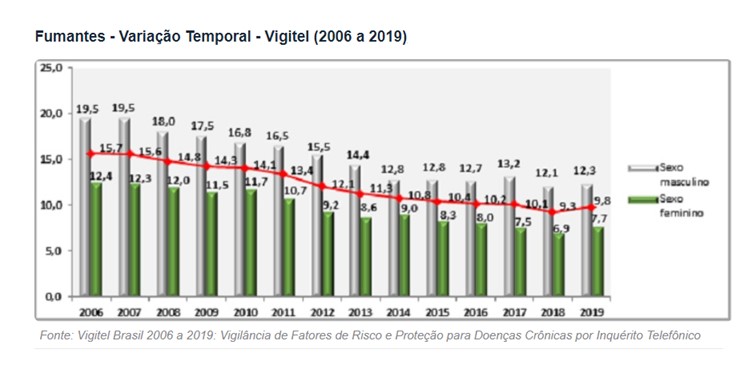 Aproximadamente 35% da população brasileira acima de 18 anos fumava em 1989, de acordo com a Pesquisa Nacional de Saúde. Em 2006, o índice registrado pelo sistema Vigitel (Vigilância de Fatores de Risco e Proteção para Doenças Crônicas por Inquérito Telefônico) já era consideravelmente menor, 15,7%.