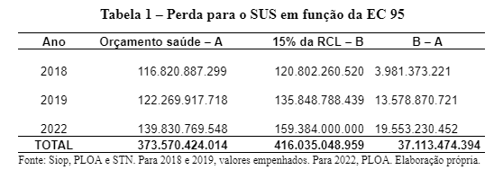 A tabela 1 mostra o impacto do congelamento do piso de saúde, levando a uma retirada de 37 bilhões do orçamento federal do SUS desde 2018.