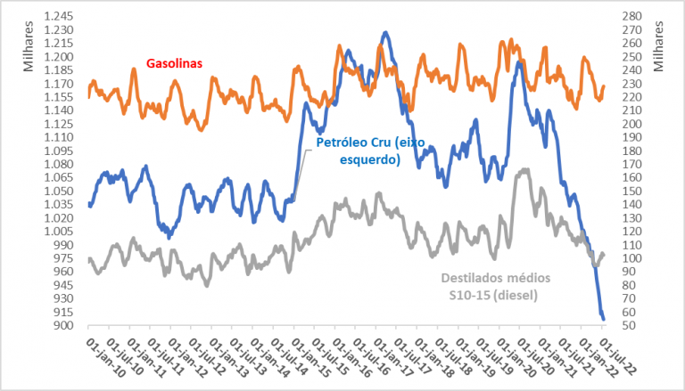 Figura 1 Estoques comerciais de petróleo, gasolina e diesel nos EUA. Janeiro 2010-julho 2022. Mil