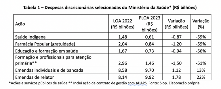Mesmo despesas obrigatórias de saúde sofrerão redução em 2023. Por exemplo, o Programa Nacional de Imunizações tem orçamento em 2022 de R$ 13,6 bilhões (contando os recursos relacionados à Covid-19, oriundos de reabertura de crédito extraordinário), passando a uma previsão orçamentária de R$ 8,6 bilhões em 2023. Ou seja, uma queda nominal de R$ 5 bilhões ou 37% entre 2022 (LOA) e 2023 (PLOA).