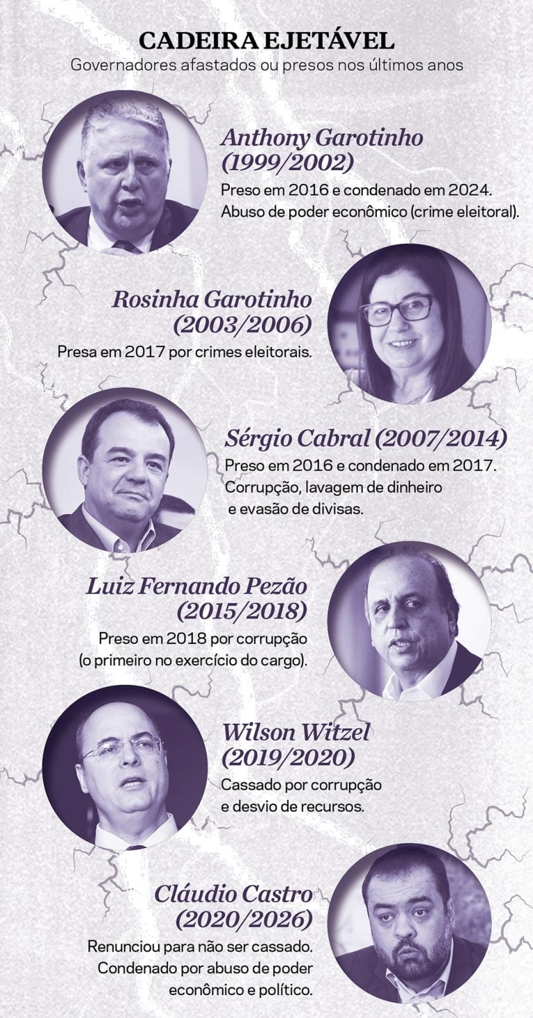 Fontes: Tribunal de Justiça do Rio de Janeiro e Tribunal Superior Eleitoral. Imagem: Redes Sociais, Agência Senado, Agência Brasil, Palácio do Planalto/PR e GOVRJ