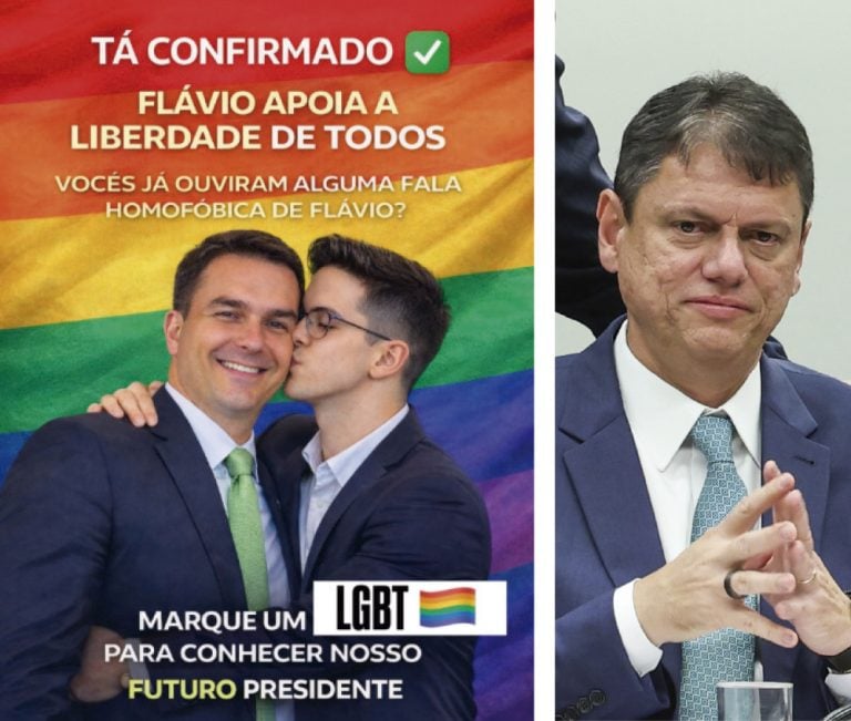 Agora, Flávio se apresenta até como defensor dos direitos LGBT. Se for eleito, Tarcísio perde a chance de disputar a Presidência em 2030. O governador se engajará em sua campanha? – Imagem: Lula Marques/Agência Brasil e Redes Sociais