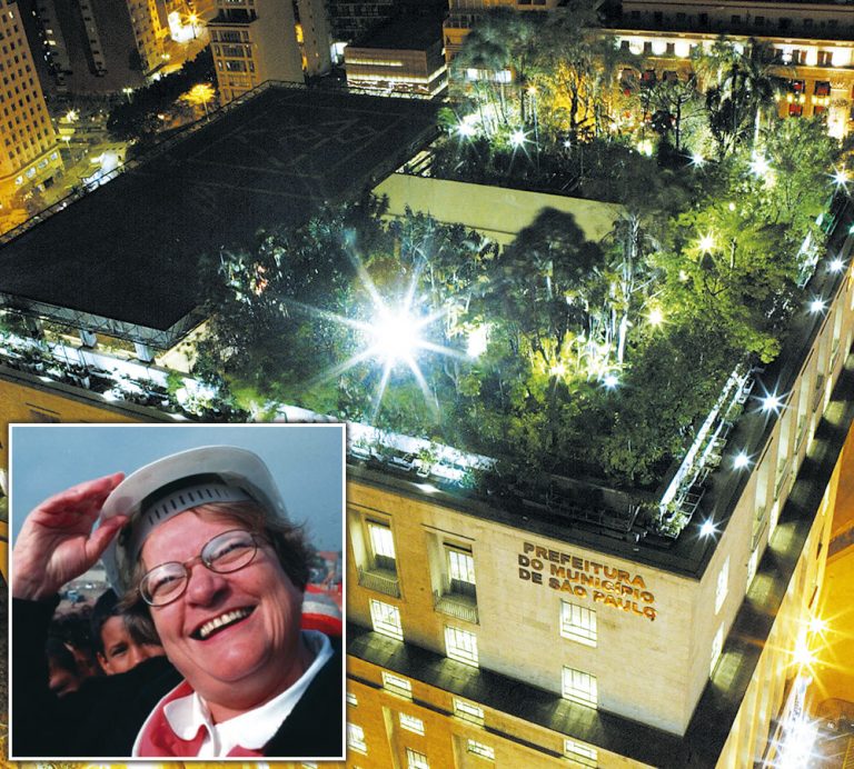 Entre os modelos T a trafegar no Viaduto do Chá, Luiza Erundina, prefeita redentora, encara o emblema de uma pujança paulistana que ainda não estava perdida – Imagem: Luiz Carlos Murauskas/Folhapress e João Wainer/Folhapress