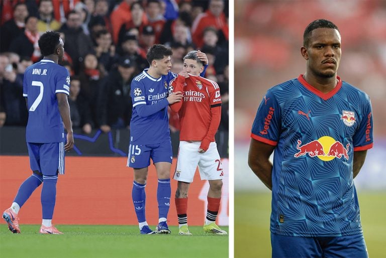 Prestianni (de vermelho) e Marques: a covardia é um traço comum – Imagem: Ari Ferreira/Red Bull Bragantino e Patricia de Melo Moreira/AFP