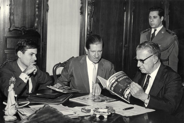 Mino Carta, ao lado de Victor Civita, apresenta a revista ‘Quatro Rodas’ ao então governador de São Paulo Adhemar de Barros. Foto: Acervo Pessoal
