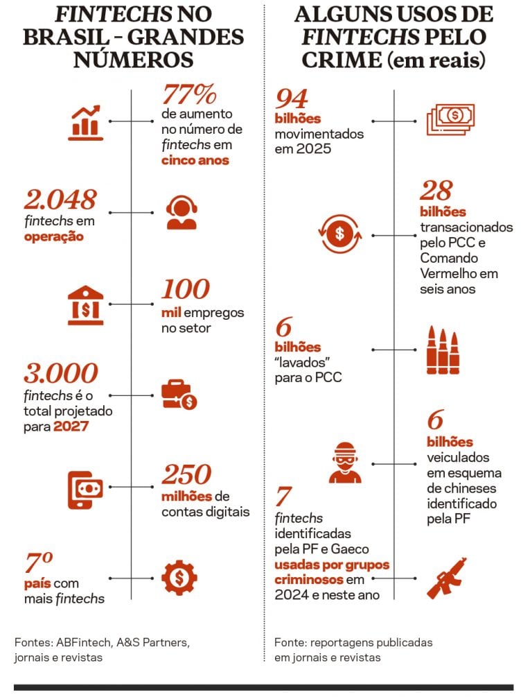 A principal instituição financeira do País, segundo os usuários, não é o Itaú, o Bradesco ou o Banco do Brasil, inconfundíveis e tradicionais, com suas logomarcas e cores próprias em cada esquina do Brasil, mas o Nubank, fintech criada em 2013 que não tem agências físicas, não capta depósitos e opera totalmente online por meio de aplicativos e da internet. É o que apurou um levantamento da empresa de pesquisas de mercado Okiar. O Nubank é preferido por 21,7% da população, o Itaú por uma parcela de 14,2% e o Bradesco, por 12%. Em outubro, seu valor de mercado, de 77,7 bilhões de dólares, superou, pela primeira vez, aquele da Petrobras, maior estatal brasileira e detentora do direito à exploração de milhões de barris de petróleo. PicPay, PagSeguro, XP Investimentos, Mercado Pago e C6 Bank são outros integrantes do que poderia ser chamado “Lado A” das fintechs. O lado B inclui o 2Go Bank e o InvBank, citados pela Polícia Federal como suspeitos de utilização pelo PCC para lavagem de dinheiro, o T10 Bank, usado em esquemas de criptomoedas em conexão com o crime organizado, e o BK Bank, braço financeiro do Primeiro Comando da Capital, entre várias instituições menos conhecidas.
