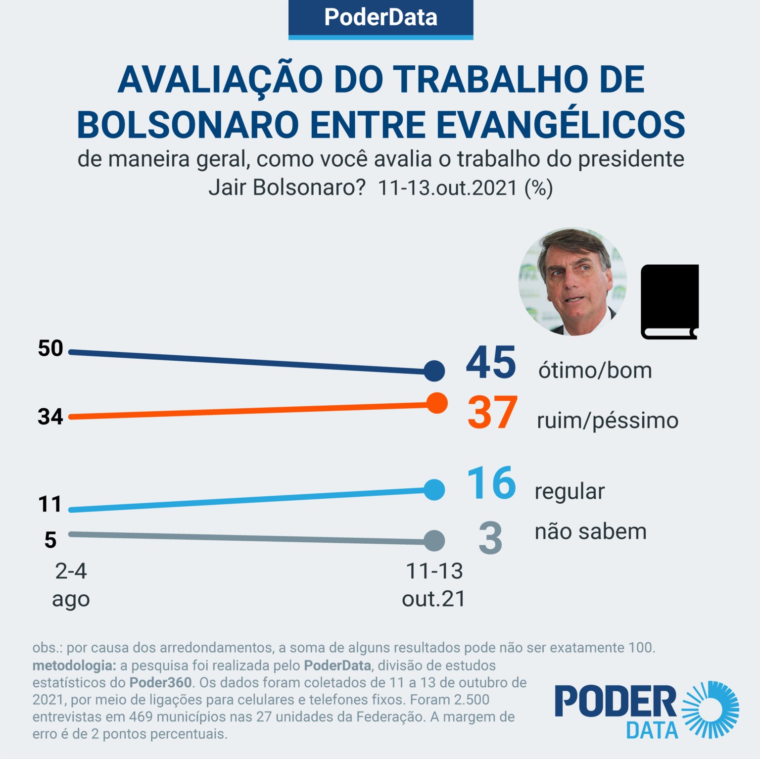 O presidente Jair Bolsonaro é considerado ótimo ou bom por 45% dos evangélicos, de acordo com pesquisa PoderData, divulgada nesta quinta-feira 14 pelo site Poder360. Em agosto, a taxa era de 50%.