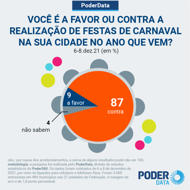 Pesquisa PoderData divulgada nesta segunda-feira 13 pelo site Poder360 mostra que 87% dos brasileiros são contrários à realização do Carnaval em suas cidades.