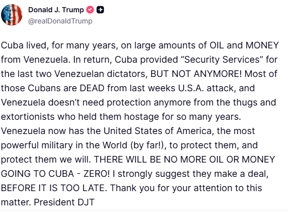 Em uma delas, Trump diz: “Não haverá mais petróleo nem dinheiro para Cuba, nada! Sugiro fortemente que façam um acordo antes que seja tarde demais”.