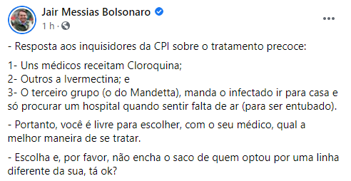 Em uma publicação no Facebook, o presidente reagiu às perguntas dos parlamentares durante o depoimento do ministro da Saúde, Marcelo Queiroga, na última quinta-feira 6.
