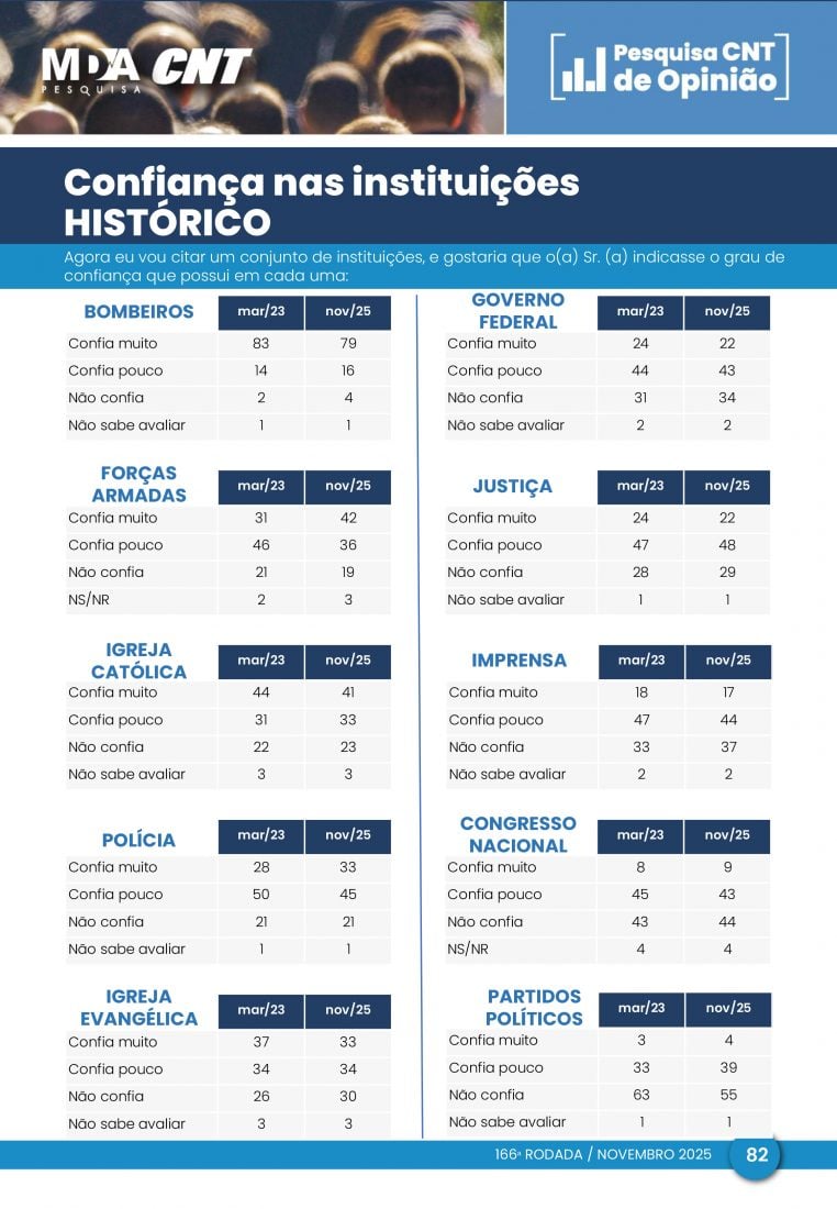 Um levantamento CNT/MDA divulgado nesta terça-feira 25 mostra que os bombeiros lideram o ranking de confiança nas instituições brasileiras, com 95% (79% confiam muito e 16% confiam um pouco na corporação). Na última colocação estão os partidos políticos, com 43% de confiança e 55% de desconfiança.