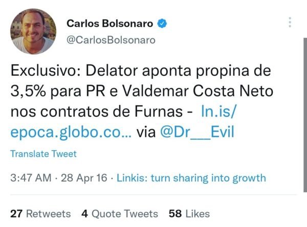 O tuíte dizia: “Exclusivo: Delator aponta propina de 3,5% para PR e Valdemar Costa Neto nos contratos de Furnas”.