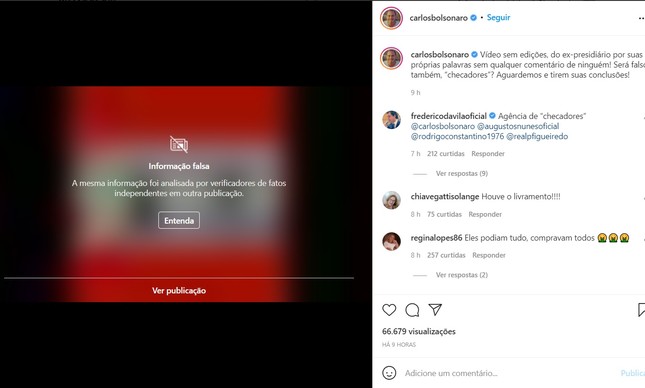 O vídeo, que é de 2015, foi marcado como falso pela rede social. Na sequência, Carlos publicou novamente: “Vídeo sem edições do ex-presidiário por suas próprias palavras sem qualquer comentário de ninguém. Será falso também, ‘checadores’? Aguardemos e tirem suas conclusões.”