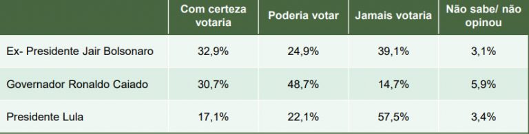 A pesquisa também mediu o impacto de indicações na hora de escolher um candidato à prefeitura. Os “padrinhos” selecionados foram o presidente Lula (PT), o ex-presidente Jair Bolsonaro (PL) e o governador Ronaldo Caiado (União):