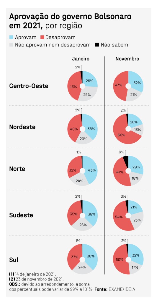Pesquisa Exame/Idea divulgada nesta sexta-feira 26 mostra que os índices de avaliação negativa do presidente Jair Bolsonaro no Nordeste e no Sudeste podem comprometer a sua reeleição.