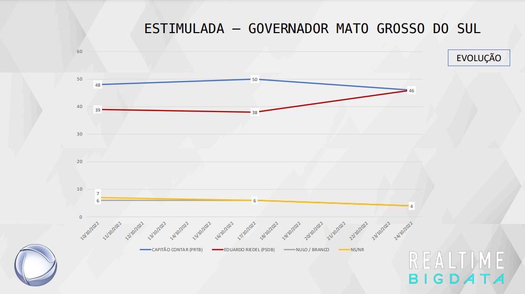 Pesquisa Real Time Big Data, divulgada nesta segunda-feira 24, mostra que a disputa pelo governo do Mato Grosso do Sul tem um empate entre Capitão Contar (PRTB) e Eduardo Riedel (PSDB).