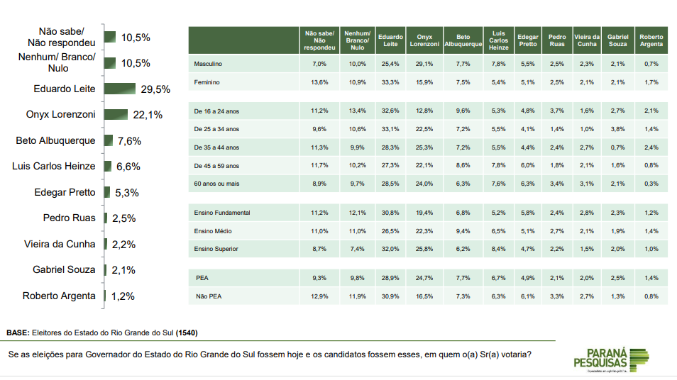 De acordo com o instituto, o tucano tem 29,5% das intenções de voto contra 22,1% de Onyx Lorenzoni (PL). Na sequência, aparecem Beto Albuquerque (PSB), com 7,6%, Luís Carlos Heinze (PP), com 6,6%, Edegar Pretto (PT), com 5,3%, Pedro Ruas (PSOL), com 2,5%, Vieira da Cunha (PDT), com 2,2%, Gabriel Souza (MDB), com 2,1%, e Roberto Argenta (PSC), com 1,2%.
