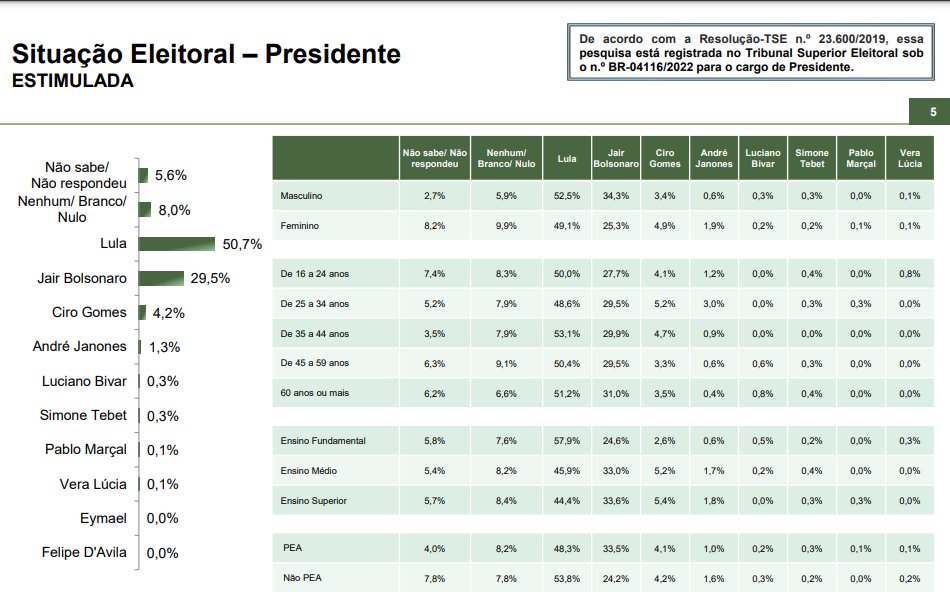 Na sequência, aparecem Ciro Gomes (PDT), com 4,2% e André Janones (Podemos), com 1,3%. Os demais pré-candidatos não chegaram a 1%.
