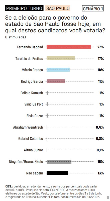 Pesquisa Exame/Ideia divulgada na quarta-feira 8 mostra Haddad com 28% das intenções de voto contra 17% de Tarcísio. França aparecem na sequência com 14% e Garcia fica com 11%.