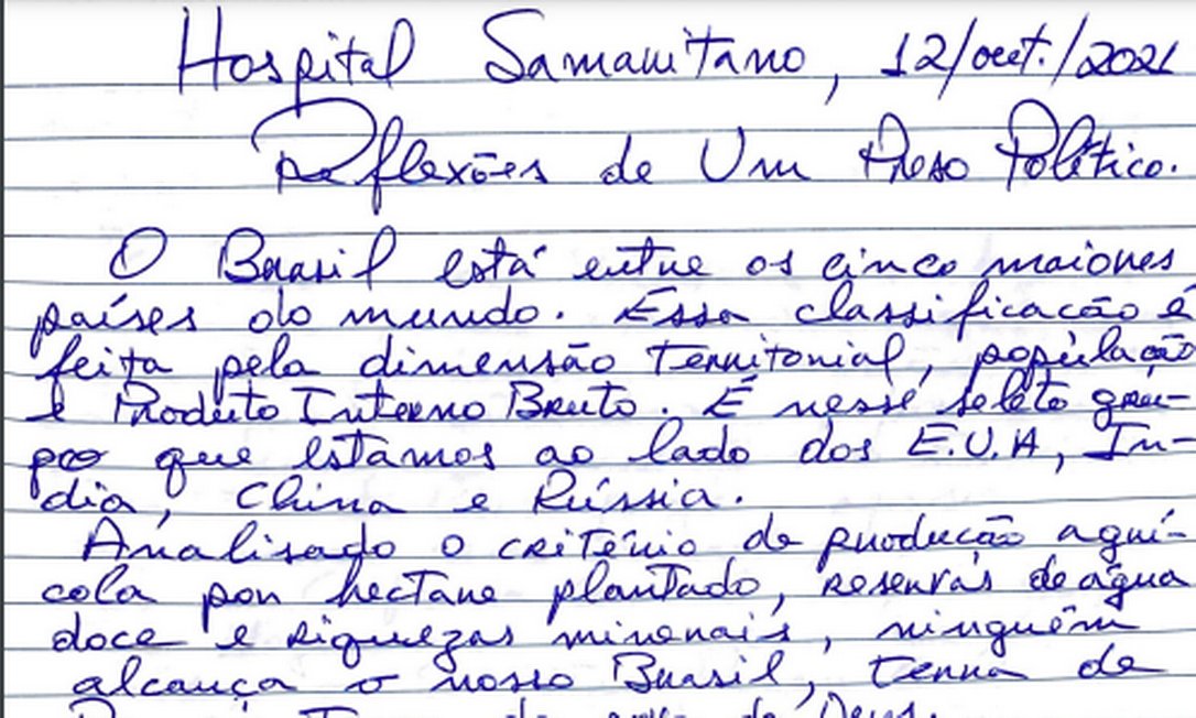 Segundo a publicação, a carta foi escrita de um hospital na Barra, no Rio de Janeiro, onde o ex-deputado — preso no inquérito dos atos antidemocráticos — se recupera de um cateterismo.