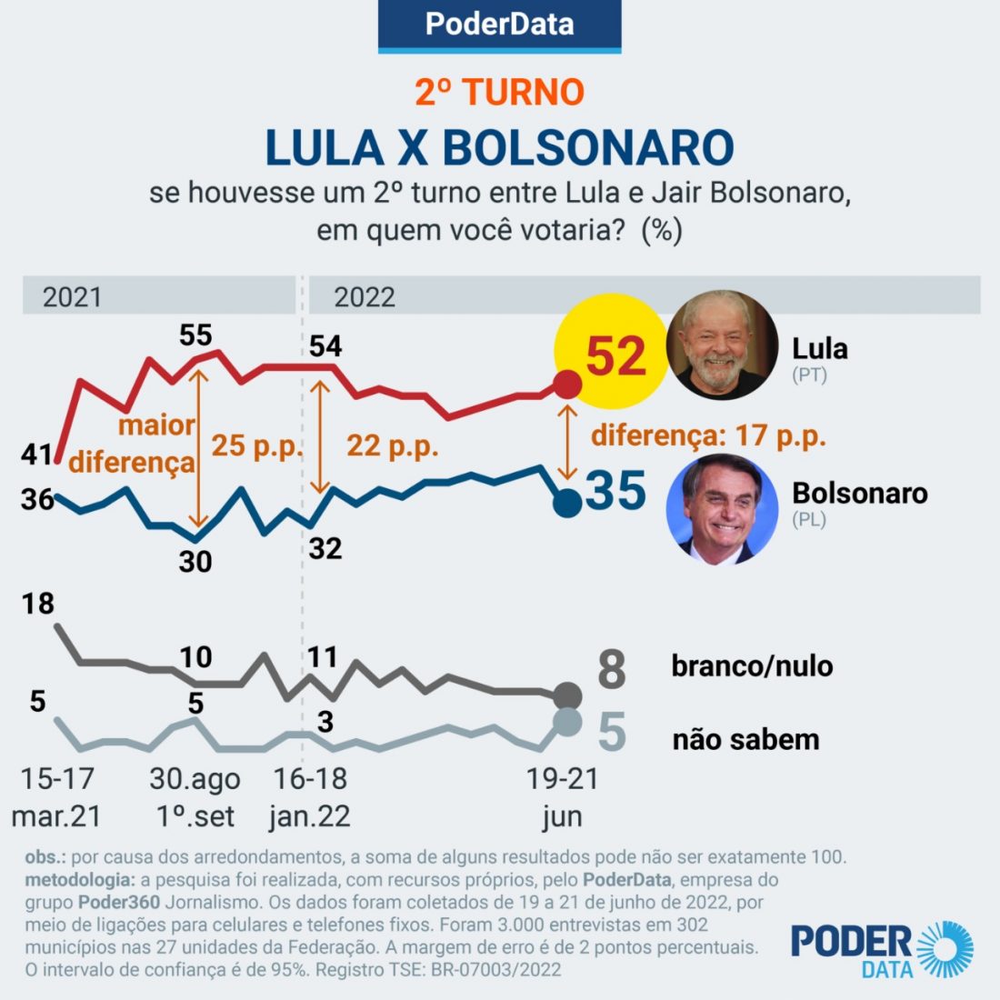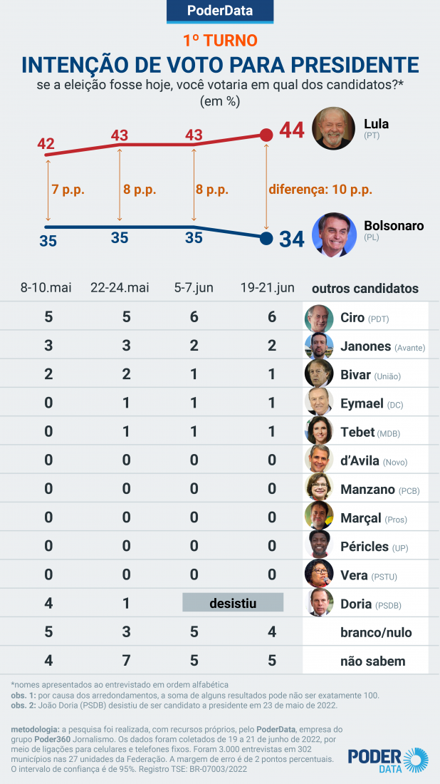 Para os resultados, o PoderData fez 3 mil entrevistas por telefone entre os dias 19 e 21 de junho. A margem de erro é de 2 pontos percentuais. O intervalo de confiança é de 95%.