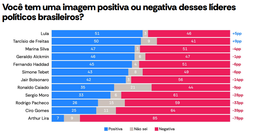 Lula, com 51% de imagem positiva, aparece tecnicamente empatado com o governador de São Paulo, Tarcísio de Freitas (Republicanos), que tem 50%. Lira marca apenas 7%, além de 85% de menções negativas. A margem de erro é de 2 pontos percentuais.