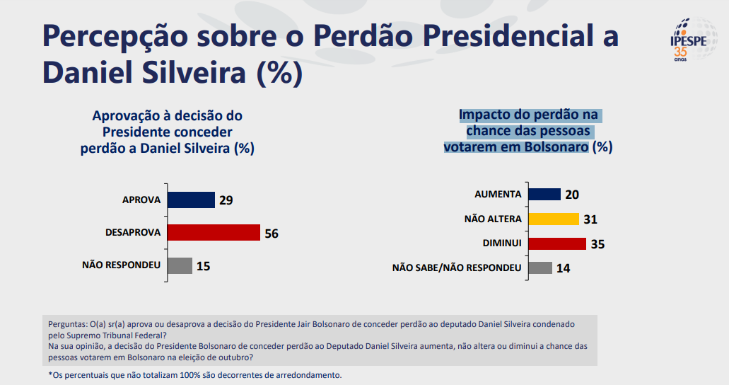 O indulto concedido pelo presidente Jair Bolsonaro (PL) ao deputado federal Daniel Silveira (PTB-RJ), condenado a nove anos e oito meses de prisão pelo Supremo Tribunal Federal, é desaprovado por 56% dos brasileiros, de acordo com pesquisa Ipespe divulgada nesta sexta-feira 6.