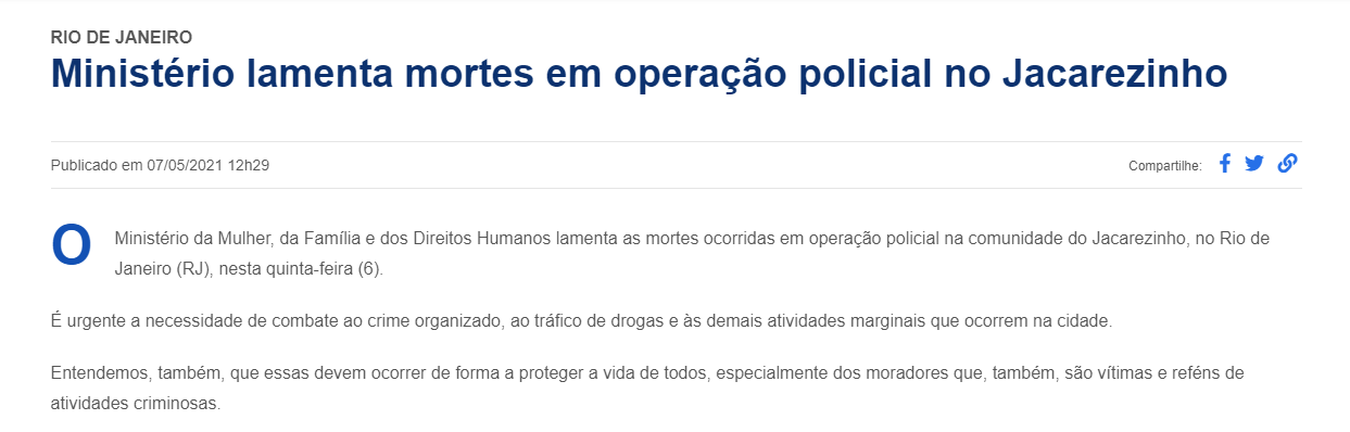 O Ministério da Mulher, Família e Direitos Humanos, comandado por Damares Alves, retirou do seu site uma nota em que se solidarizava pelas mortes na operação policial na favela do Jacarezinho, no Rio de Janeiro.