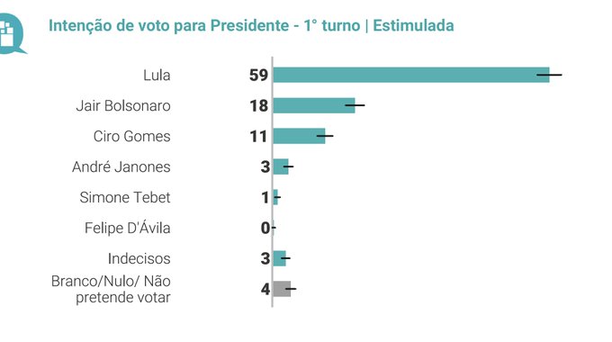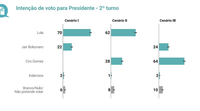 No segundo turno, de acordo com o levantamento, Lula alcançaria 70% das intenções de voto, contra 22% de Bolsonaro. Ciro também venceria o atual presidente.