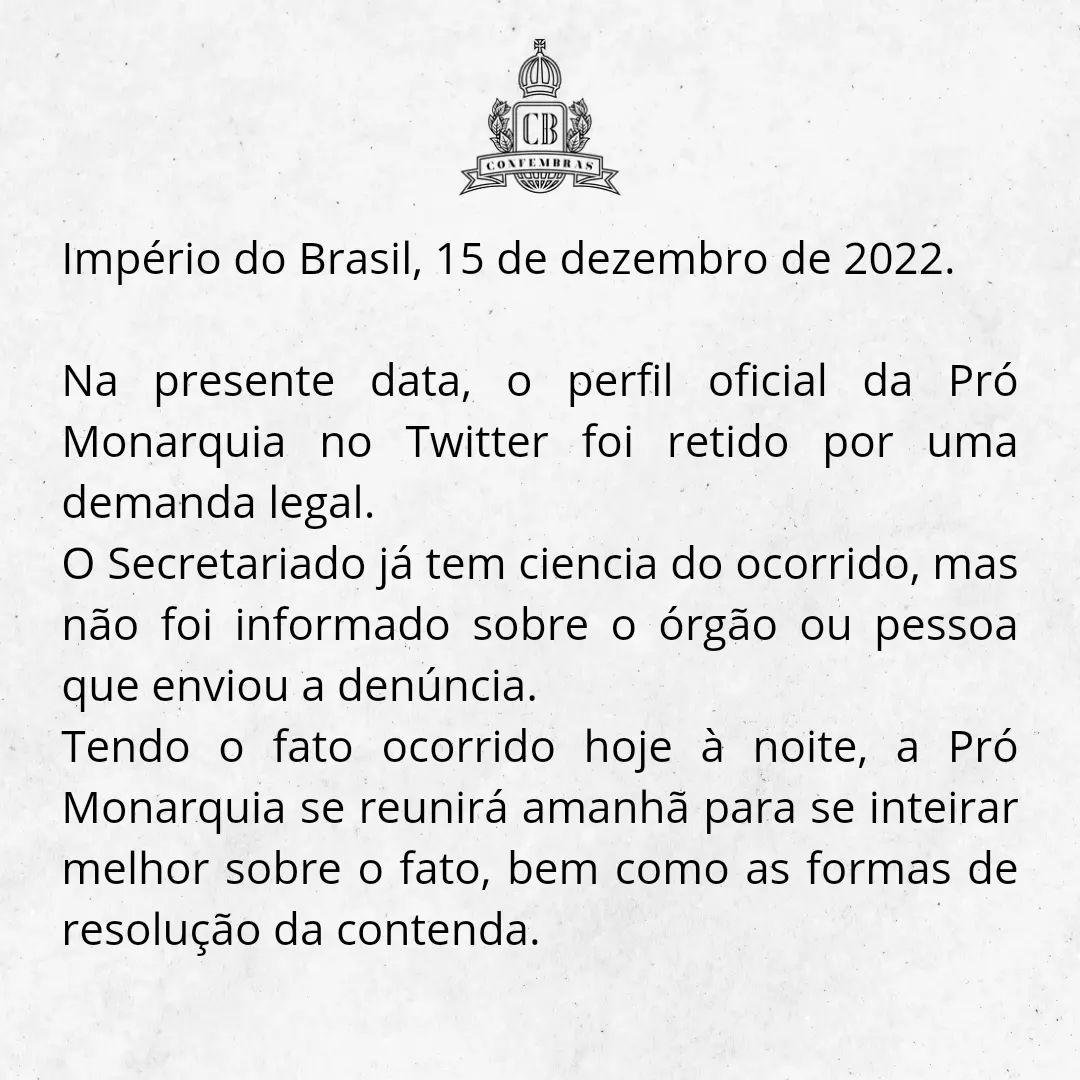 O perfil oficial da Casa Imperial do Brasil no Twitter foi suspenso na quinta-feira 15 por uma decisão judicial. De acordo com a organização que representa a família imperial no País, a decisão foi do Supremo Tribunal Federal.