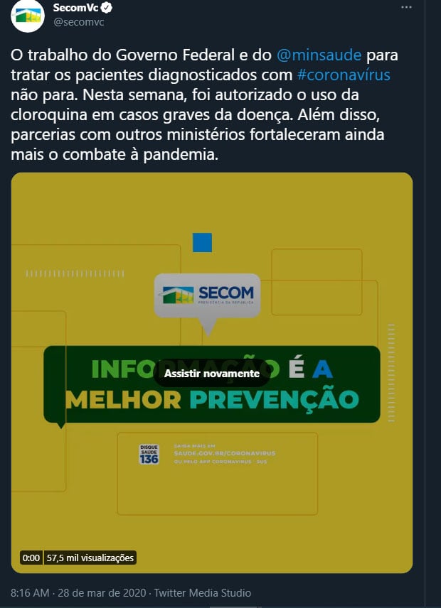 Uma postagem da Secretaria de Comunicação no dia 28 de março do ano passado, entretanto, desmente o seu então chefe.