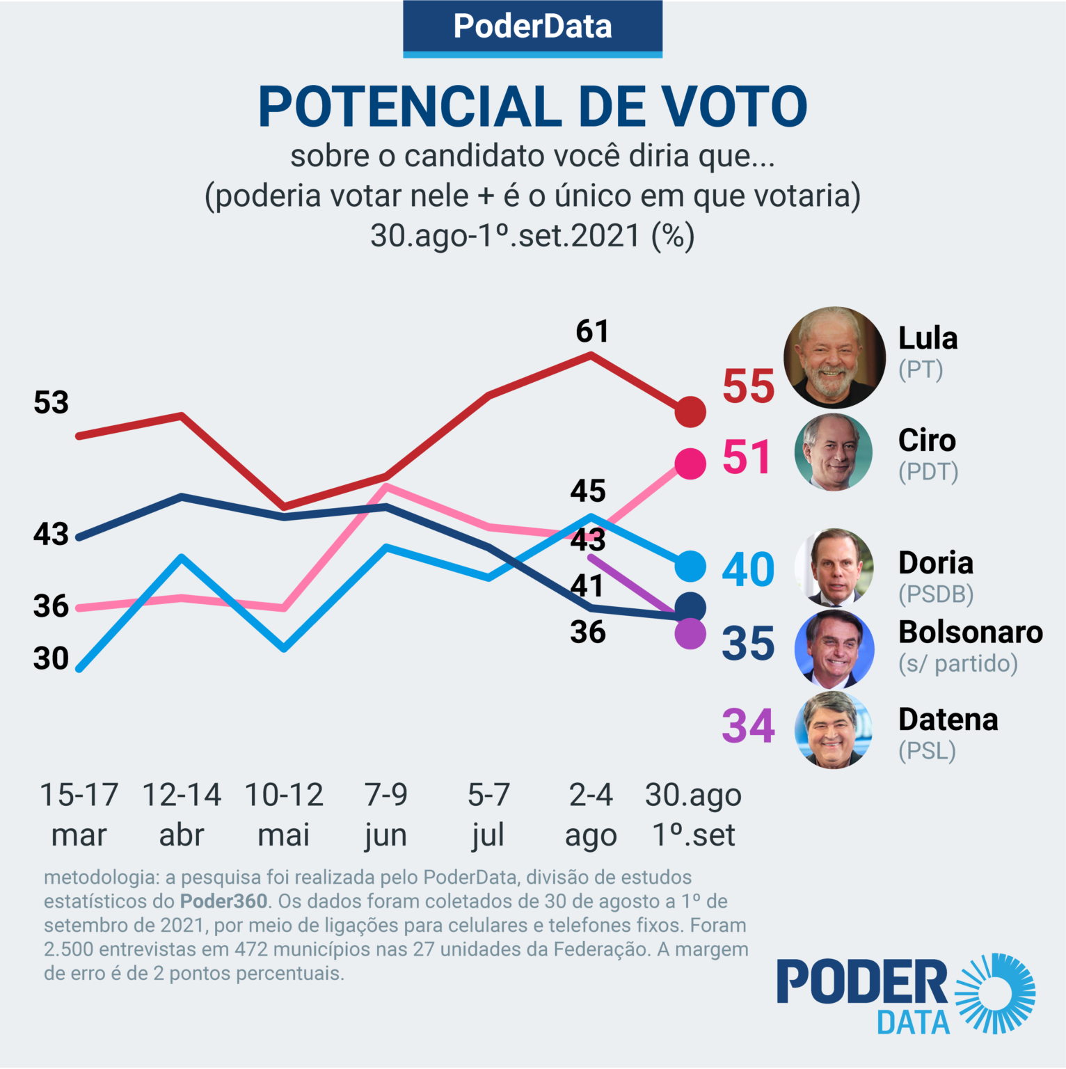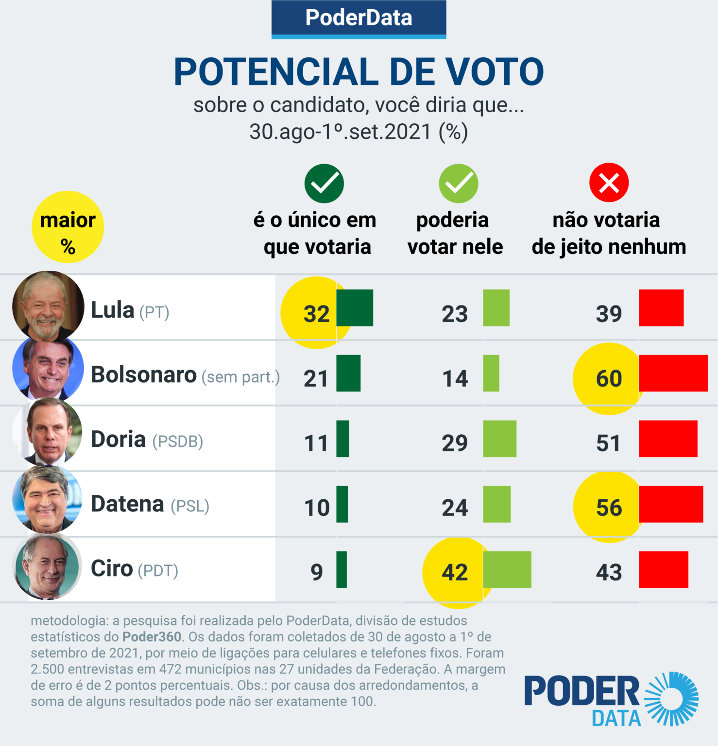 O ex-presidente Lula (PT) divide com o pedetista Ciro Gomes a liderança no potencial de votos para as eleições presidenciais de 2022, de acordo com pesquisa PoderData divulgada nesta semana.