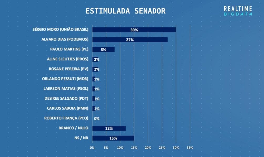 Pesquisa Real Time Big Data divulgada nesta terça-feira 16 aponta um empate técnico entre o ex-juiz Sérgio Moro (União Brasil) e Álvaro Dias (Podemos) para a vaga no Senado no Paraná.