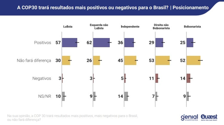 O instituto de pesquisa separou os resultados por posicionamento político dos entrevistados. Nesse contexto, é possível ver diferença clara entre pessoas de esquerda e de direita. Enquanto a maioria dos que se identificam como “lulistas” esperam impactos positivos, os que se dizem “bolsonaristas” têm maior crença de que não haverá diferença ou que os impactos serão negativos.