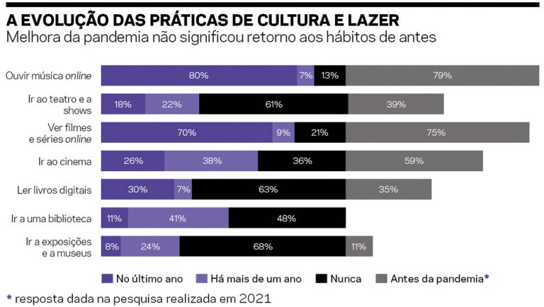 As atividades mais praticadas continuam a ser, como em 2020 e 2021, aquelas online: ouvir música, assistir filmes e séries, ouvir podcast (a atividade que mais cresceu) e jogar games. Na comparação entre as respostas sobre os tempos pré-pandêmicos e os atuais, o hábito que mais se perdeu foi o de ir ao cinema (ver quadros à esq.).