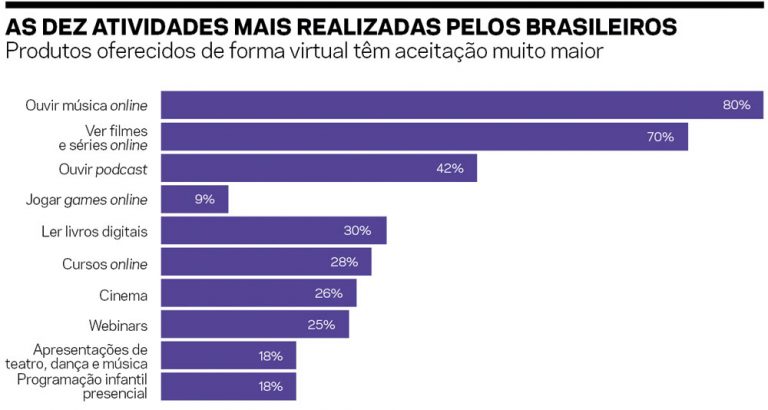 Curiosamente, porém, no caso de shows musicais, por exemplo, 72% dos entrevistados disseram que, tendo a opção entre o online e o presencial, dariam preferência à experiência presencial. E a atividade citada como aquela da qual as pessoas mais sentem saudade é o cinema.