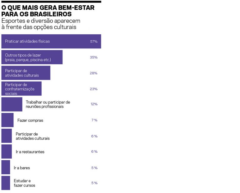 Chama, por fim, atenção o fato de a cultura ser a terceira atividade entendida pelos entrevistados como benéfica para o bem-estar geral (ver quadro à esq.).
