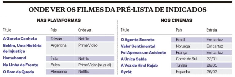 Com a estreia do filme sul-coreano A Única Chance, na quinta-feira 22, serão quatro os títulos da pré-lista de 15 indicados ao Oscar de Filme Internacional – da qual faz parte O Agente Secreto – em cartaz nos cinemas brasileiros. Há, ainda, outros cinco títulos da relação divulgada pela Academia de Artes e Ciências Cinematográficas de Hollywood disponíveis no streaming.