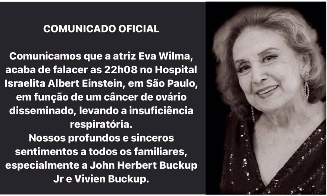 Morreu no sábado 15 a atriz Eva Wilma, que tratava de um câncer de ovário. Ela estava internada no Hospital Albert Einstein, na Zona Sul de São Paulo, desde o dia 15 de abril, para tratamento de problemas cardíacos provenientes do tumor.